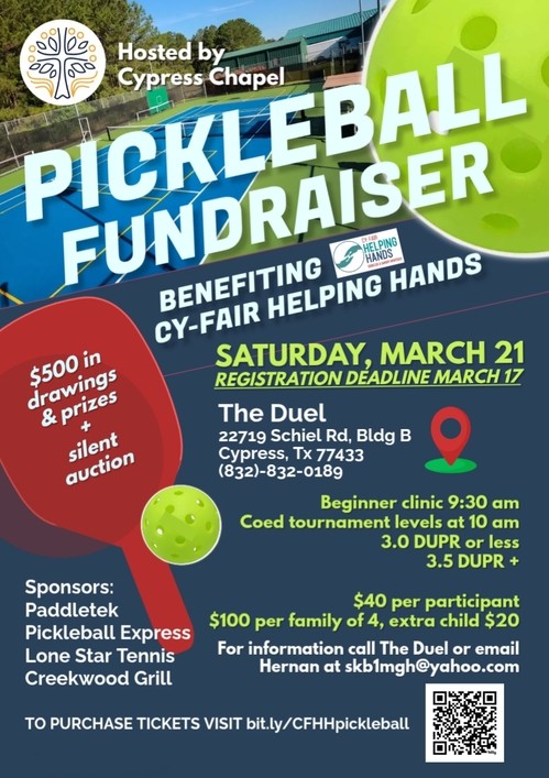 March 21st: Pickleball Fundraiser for Cy-Fair Helping Hands at The Duel, 10:00 am - 2:00 pm