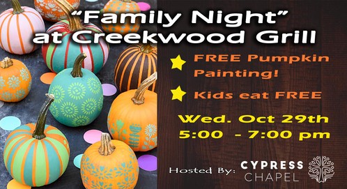 October 29th: Family Night at Creekwood Grill, 5:00 pm - 7:00 pm: "Pumpkin Painting"
